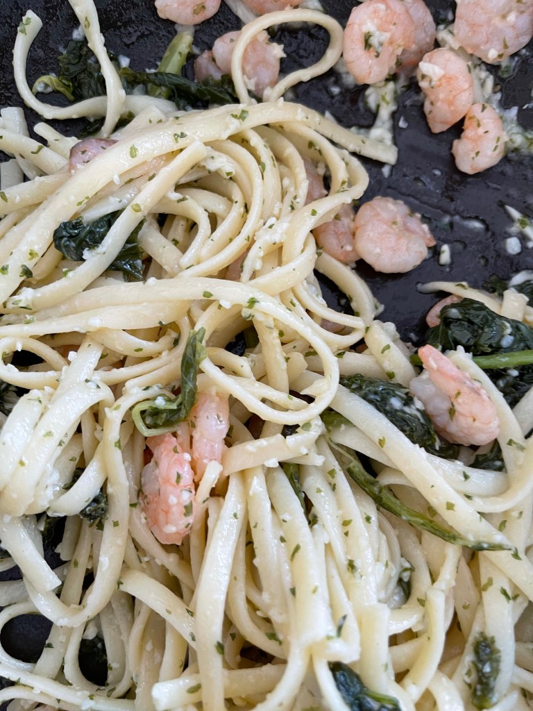Dump In shrimps and let them swim in the pool of sizzling garlicky olive oil