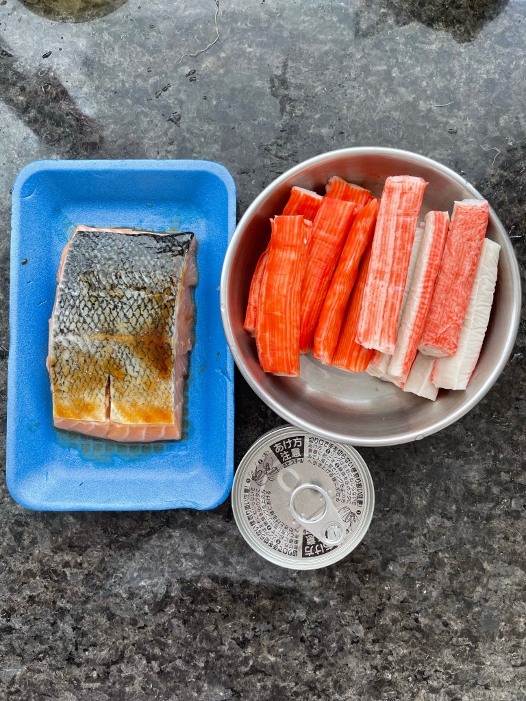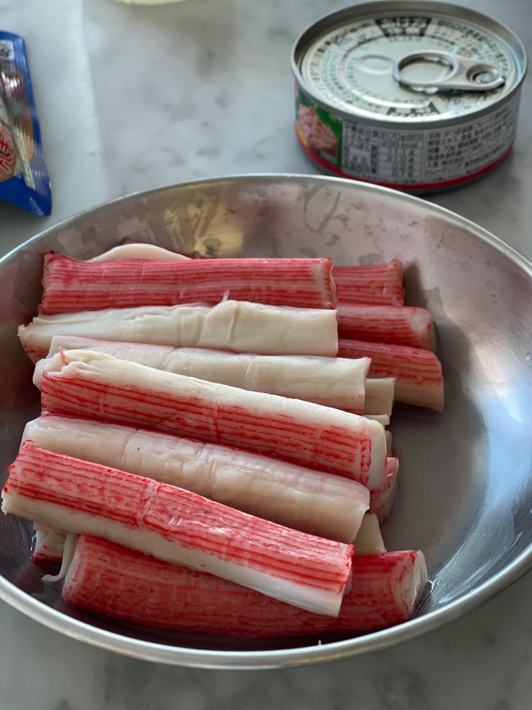 - Prepare fillings by mixing tuna or crab sticks with mayonnaise